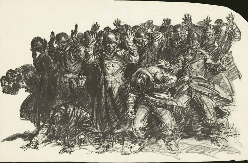 Cpl. Ted Paluch, T/4 Irwin Sheetz, and Pvt. R.L. Smith were riding in a weapons carrier approximately fifty yards south of a key crossroads. Initially, they believed they were under attack from an air raid due to the sound of intense gunfire. Exiting their truck, they sought cover in a small ditch. Moments later, they saw a panzer tank’s muzzle pointed directly at them. Recognizing the futility of running, they surrendered.