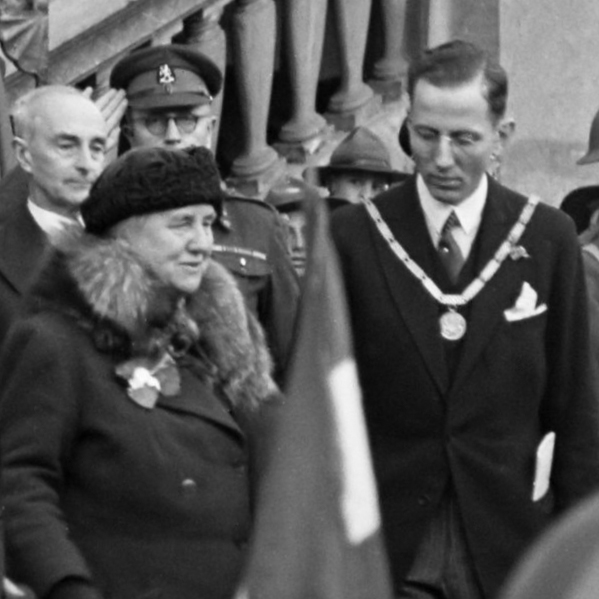 Koningin Wilhelmina bij het verlaten van het stadhuis te Maastricht