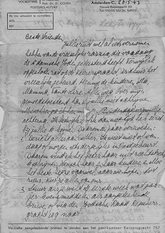 In late May 1943, Annelise’s father, Maurits found out while he was in his office at the Jewish council, that his family was picked up during a raid in Amsterdam. He wrote a letter to some friends telling them about the fate of his family and that he would voluntarily join them in the Westerbork concentration camp. He also asked friends to send letters and parcels.