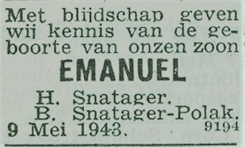 Emanuel Snatager. born May 9,1942. Died in Westerbork May 26,1943.