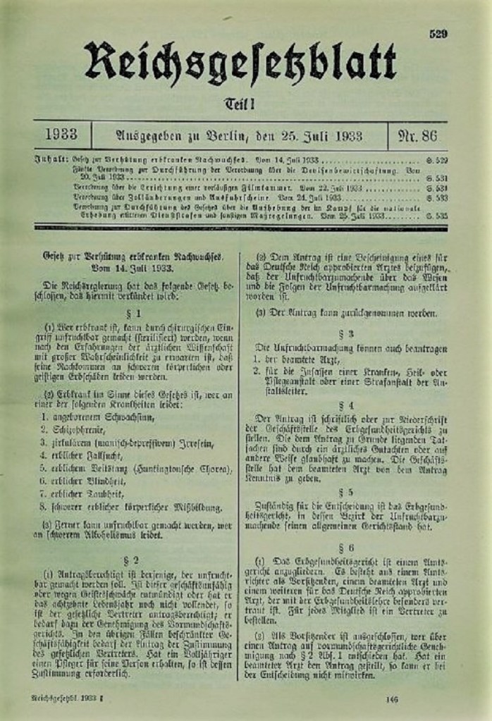 19-year-old Gerda D. was hospitalized in the psychiatric emergency ward of a hospital in Berlin. Although the diagnosis of Gerda as schizophrenic was uncertain, she was released only after being sterilized under the Law for the Prevention of Progeny with Hereditary Diseases.