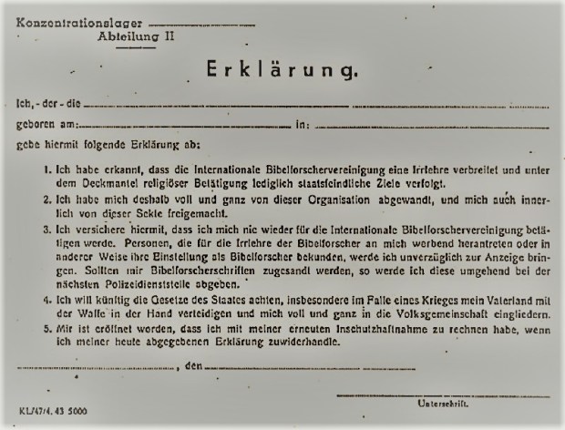 The imprisoned Jehovah’s Witnesses were given the document below. By putting a signature on that declaration they would be renouncing their faith and would be released. Of all the Jehovah Witnesses imprisoned, only fa handful of approximately two-thousand signed the declaration and were released.(The translation of the document is below too)