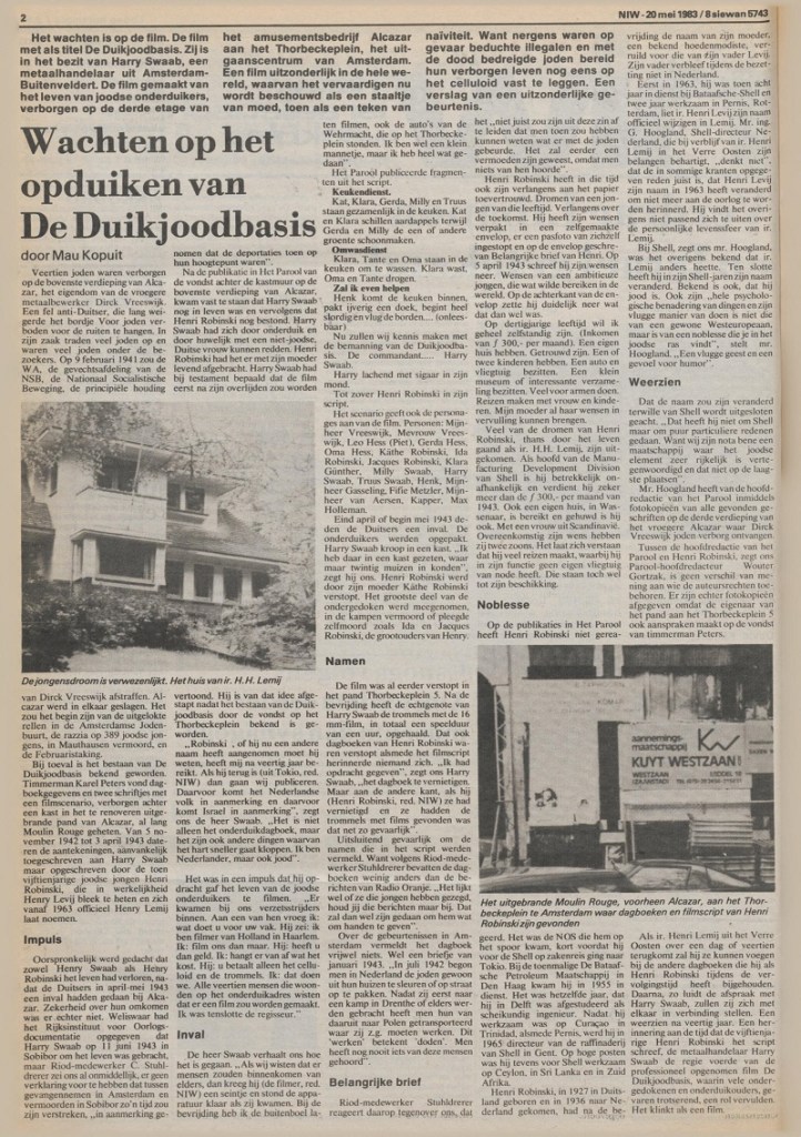 In 1983, during the renovation of a nightclub on the Thorbeckeplein, a film that had been made there forty years ago surfaced. The film was called Duikjoodbasis,(Jewish hiding place) and the screenplay was written by the then thirteen-year-old Henry Robinski. It was made with and by the fourteen Jews who were in hiding above the nightclub Alcazar until May 28, 1943. Hendrik Swaab, who conceived the idea for the film in 1943, said in 1983 in the NIW(New Israeli Weekly) that the reason for making the film was boredom.