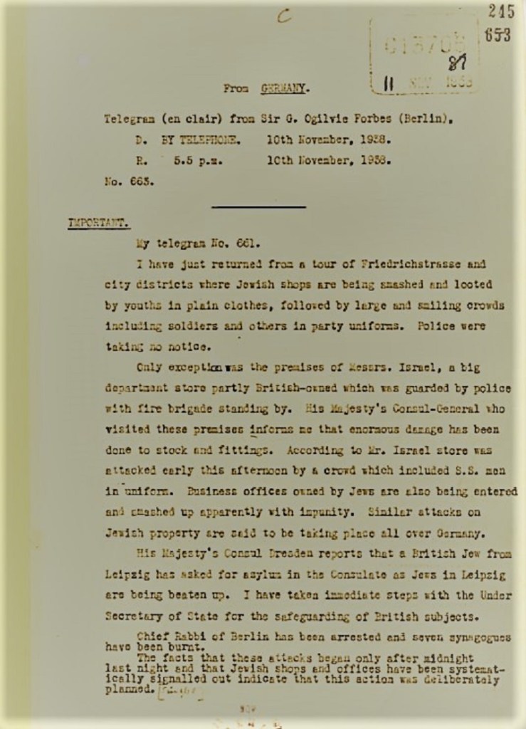 Telegram from Sir G Ogilvie Forbes regarding the damage dealt to Jewish properties during ‘Kristallnacht’ on 10 November 1938.