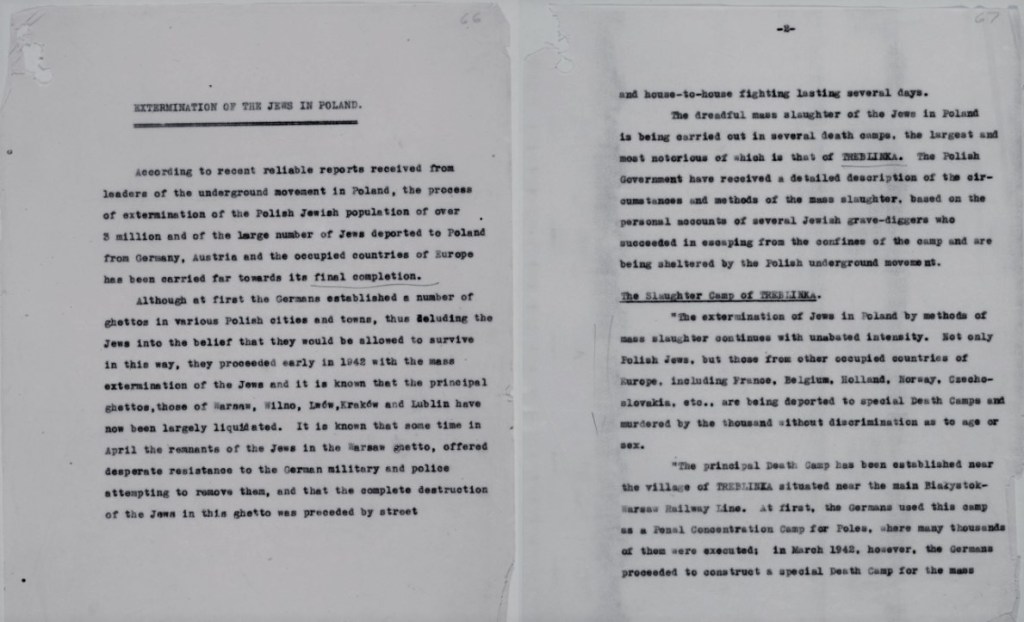 According to recent reliable reports received from leaders of the underground movement in Poland, the process of extermination of the Polish Jewish population of over 3 million and of the large number of Jews deported to Poland from Germany, Austria and the occupied countries of Europe has been carried far towards its final completion.