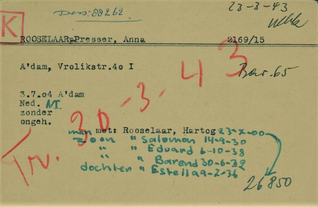 The Rooselaar family lived in Amsterdam, the Netherlands. They were moved or rather deported to Westerbork at some stage. I know this because there are records for 30 March 1943, when the family took the transport train from Westerbork to Sobibor. They arrived in Sobibor on 2 April 1943, where upon arrival, they were all murdered.