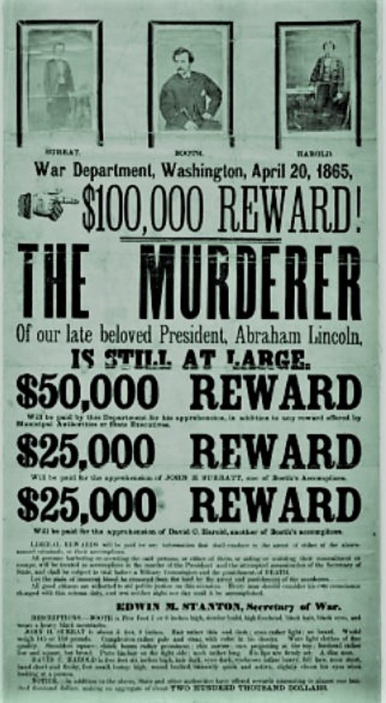 Booth shot President Lincoln once in the back of the head. Lincoln’s death the next morning completed Booth’s piece of the plot. Seward, severely wounded, recovered, whereas Vice President Johnson was never attacked. Booth fled on horseback to Southern Maryland on his horse called Peanuts. A reward of $100,000 was issued for his capture. Also rewards of $50,000 and $25,000 for some of Booth’s conspirators.