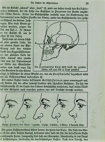 Following the Nazi rise to power, new textbooks were introduced to make sure that all content taught by teachers was in line with the Nazis’ beliefs. This page is taken from a Nazi racial science textbook published in 1934. In the bottom right corner, someone has added another side profile with stereotypically Jewish features and written Jüden, meaning Jews, next to it.