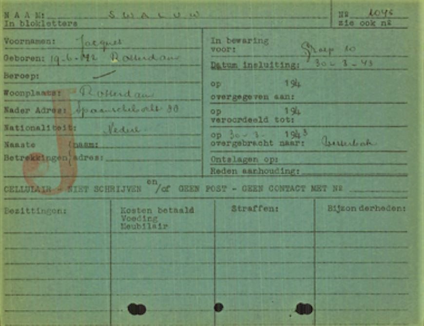 19 June 1942 Esther had another child, named Jacques. He received the family name of Swaluw so it is not clear who Jacques‘ father was. At Esther’s registration on 1 October 1941 by the Jewish Council, her civil status was listed as “divorced.” Also, a note made in April 1943 by the Jewish Council reveals that the 3rd child (Jacques) has not been acknowledged by Jan Houtman.