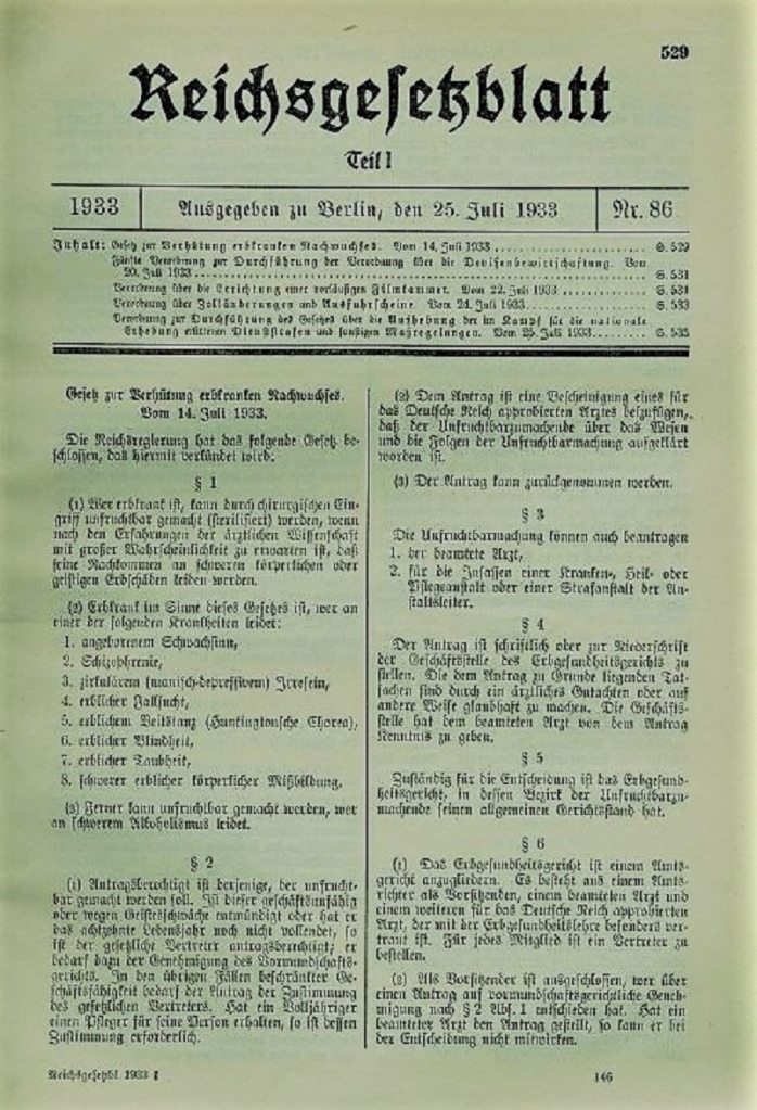 On July 14,1933 the Nazi regime fulfilled the long-held dreams of eugenics proponents by enacting the Law for the Prevention of Genetically Diseased Offspring. Individuals who were subject to the law were those men and women who “suffered” from any of nine conditions listed in the law: hereditary feeblemindedness, schizophrenia, manic-depressive disorder, hereditary epilepsy, Huntington’s chorea (a rare and fatal degenerative disease), hereditary blindness, hereditary deafness, severe physical deformity, and chronic alcoholism.