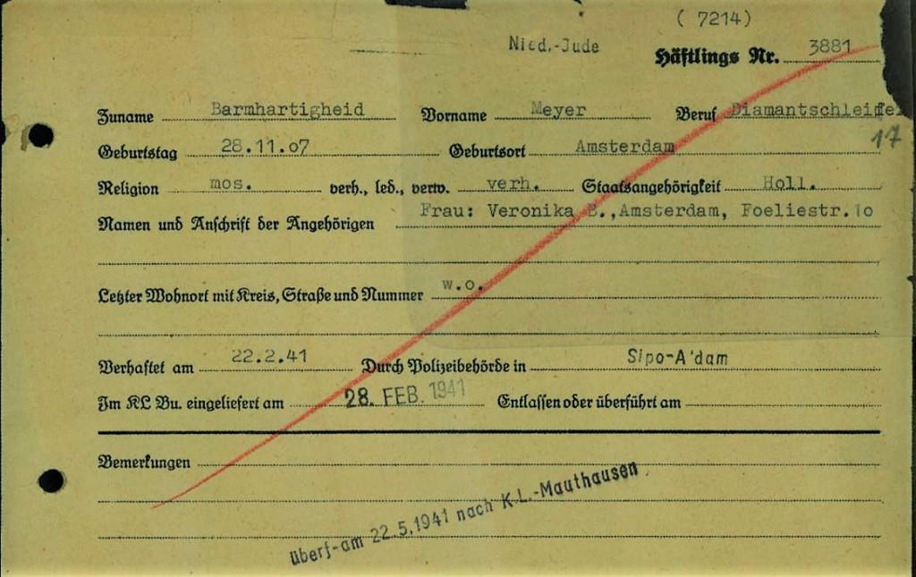 The picture above is an arrest card of Meijer Barmhartigheid. He was one of the 389 young Jewish man who were arrested during raid in Amsterdam on February 22 and 23 ,1941.