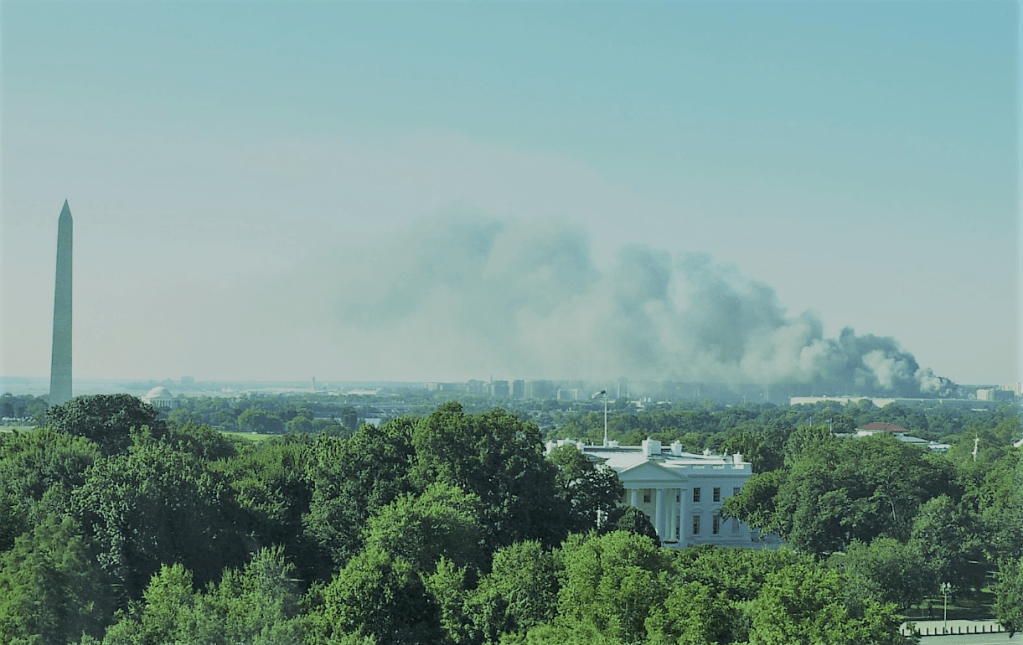 People watch from Jersey City, N.J. as the North Tower dissolves in a cloud of dust and debris about a half hour after the South Tower collapsed. More than 1,600 people in and around the building are killed. Only 102 minutes passed between the time of the first plane crash and the collapse of the second tower.