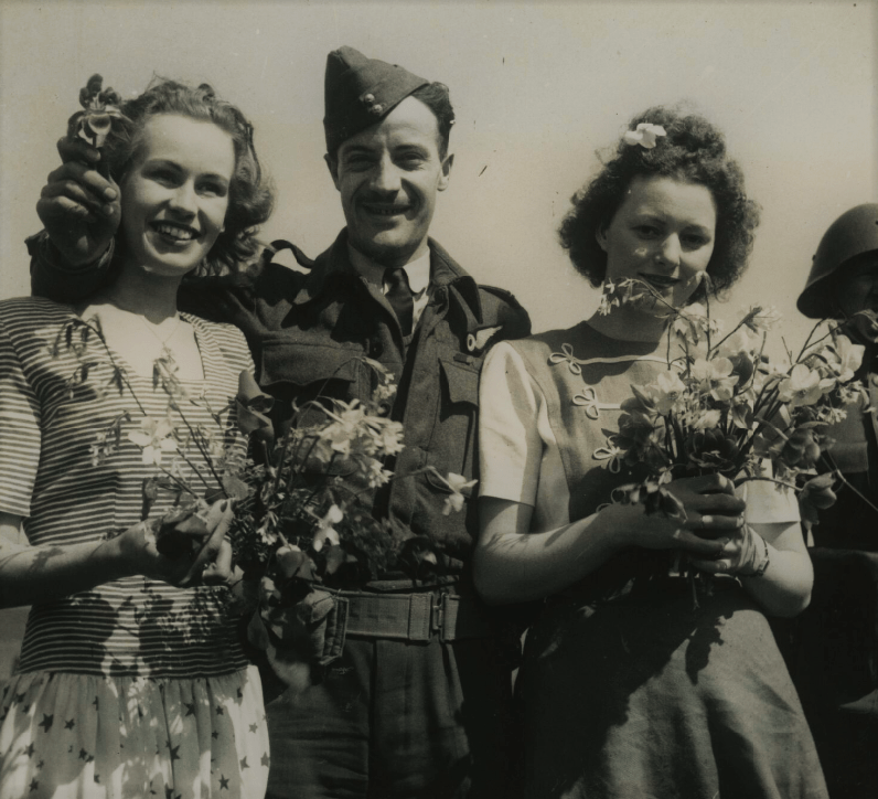 A soldier stands between two young women, each holding a bouquet of flowers. The place is unknown.