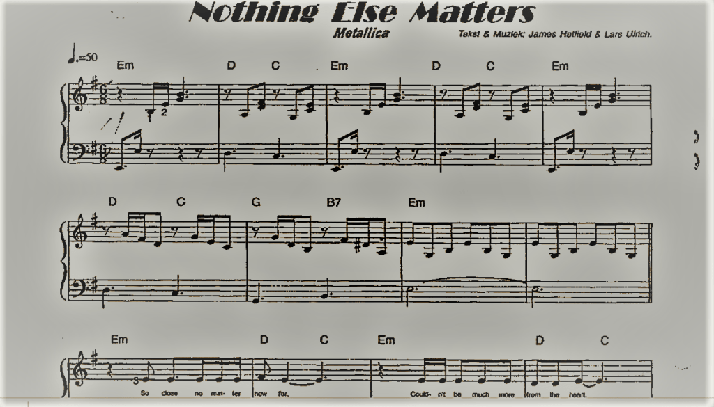 “Nothing Else Matters” by Metallica, was released in 1992 as the third single from their self-titled fifth studio album, Metallica. The song peaked at number 11 on the Billboard Mainstream Rock Tracks chart, number 6 on the UK Singles Chart, number 1 in Denmark, and reached the top ten on many other European charts. “Nothing Else Matters” was featured as a playable track in the music video game Guitar Hero: Metallica. Recognized as one of Metallica’s best known and most popular songs, the power ballad has become a staple in live performances.