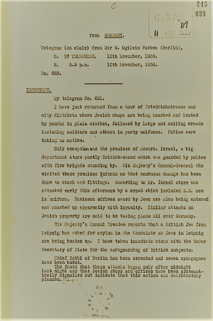 Telegram from Sir G Ogilvie Forbes regarding the damage dealt to Jewish properties during ‘Kristallnacht’ on 10 November 1938