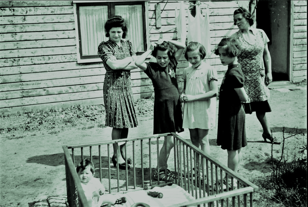 The girl in the play pen is Renee Sara Gottschalk, born in the Central Refugee Camp Westerbork on 21 June 1941. The two girls in the dark dresses are the daughters of chief physician F. Spanier. The lady on the right is Rosa Strauss; Renee Sara’s mother. Her father is