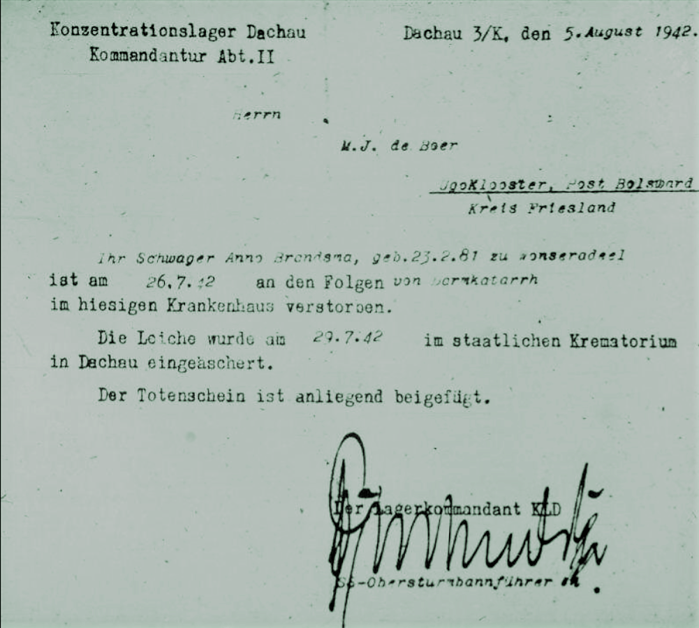 After being held prisoner in Scheveningen, Amersfoort, and Cleves, Brandsma was transferred to the Dachau concentration camp, arriving there on 19 June. His health quickly gave way, and he was transferred to the camp hospital. He died on 26 July 1942, from a lethal injection administered by a nurse[of the Allgemeine SS, as part of their program of medical experimentation on the prisoners.