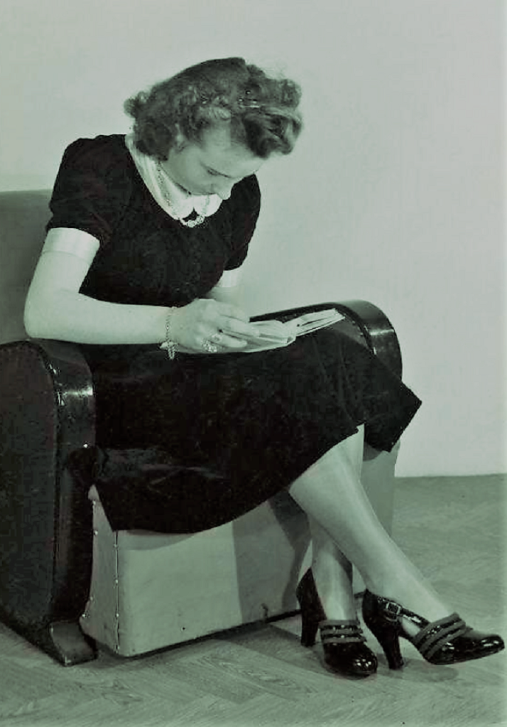 Shoe fashion. Women’s high-heeled shoes in black patent leather and side closure with buckle. Black suede trim. The shiny stockings are made of fil d’écosse (shiny cotton yarn). Netherlands March 14, 1941.