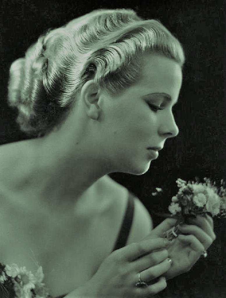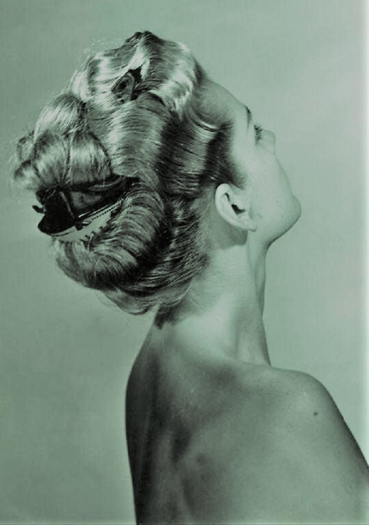 France. Hair fashion 1940. The blond hair is undulated with strokes on the sides. Coiffure Jean Pierre.