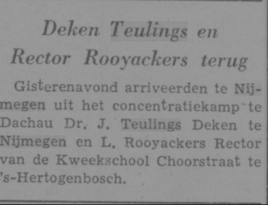After the liberation, on 5 May 1945, Chaplain Schellekens, Chaplain Wim van Helden and border guard officer Van der Krabben decided to travel to Dachau to see if they could find Dean Teulings and also Rector Rooyackers from Den Bosch. They arranged for a car, papers, materials and petrol and arrived in Dachau after the two-day journey.