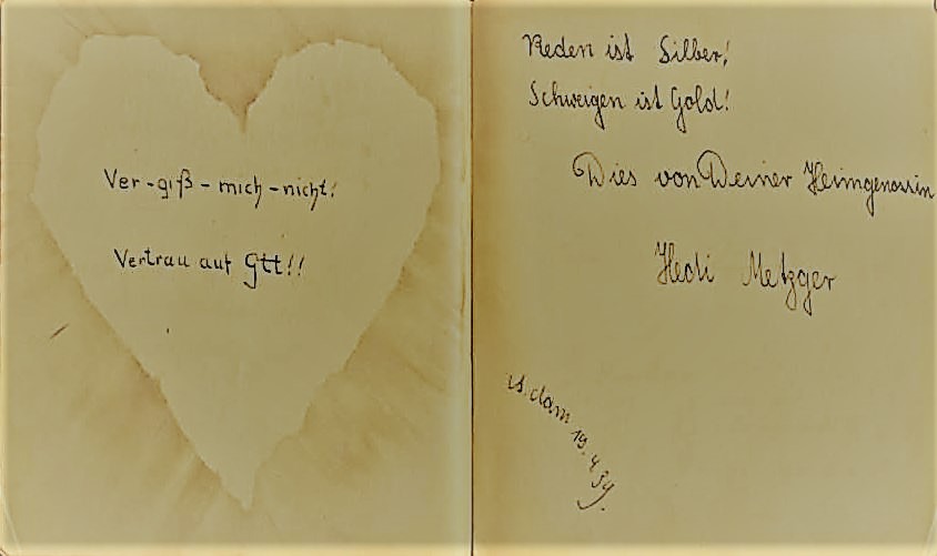 The text is in German and it says. “Forget me not, trust in G-d. Speaking is silver, and silence is gold. This from your memories, Hedi Metzger, Amsterdam 19-4-1939.”