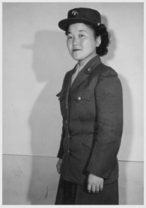 Private Shizuko Shinagawa, 21, of the Women’s Army Corps, who was sent to Denver to recruit Japanese-American women for the WAC. May 22, 1944, Denver, Colorado. Courtesy of WRA no. G-563, War Relocation Authority Photographs of Japanese-American…
