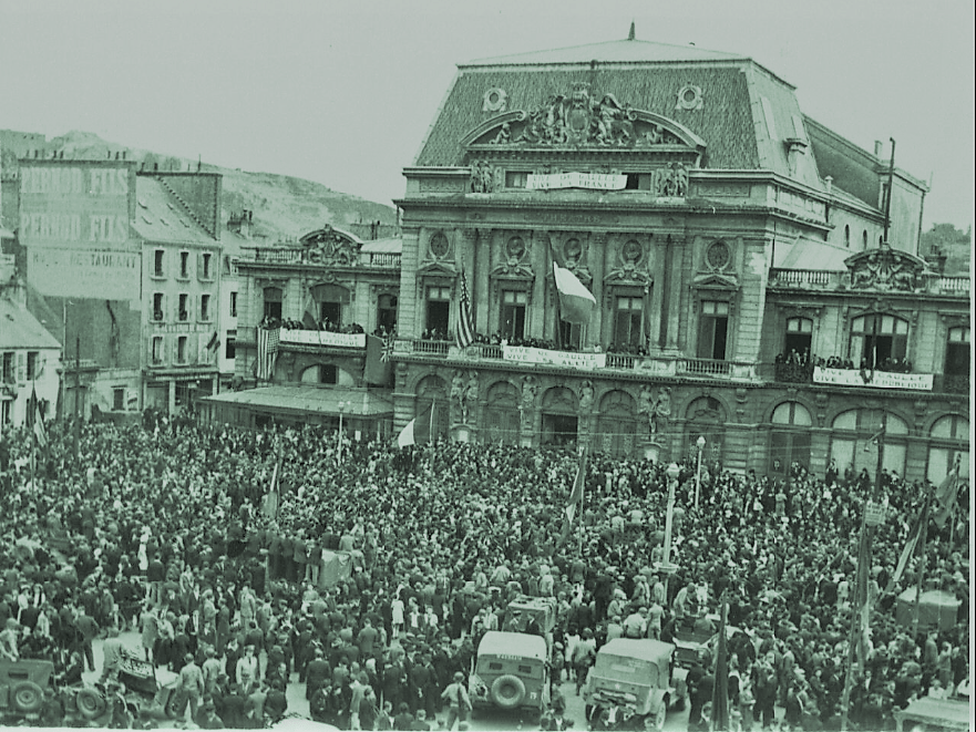 Singing The Marseillaise, Frenchmen crowd the square before the Municipal Theater in Cherbourg Bastille Day, 14 July 1944. Formerly called Petain Square, an official ceremony was held on the national holiday to rename the square after General de Gaulle.