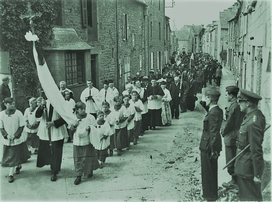 Altar boys lead the funeral procession through Barfleur on Bastille Day, 14 July 1944, for Abbe Jules Gaslonde, a French priest killed by a mine left by the Nazis in their retreat before Allied forces. Note the Allied officers saluting at the lower right. A former vicar, Abbe Gaslonde, was from a village near St. Lo. The Nazis transferred him when he defied Nazi orders by hanging the Tricolor in his church. The Abbe was put to death when he returned on his bicycle from administering last rites to three French civilians fatally wounded by another Nazi mine.