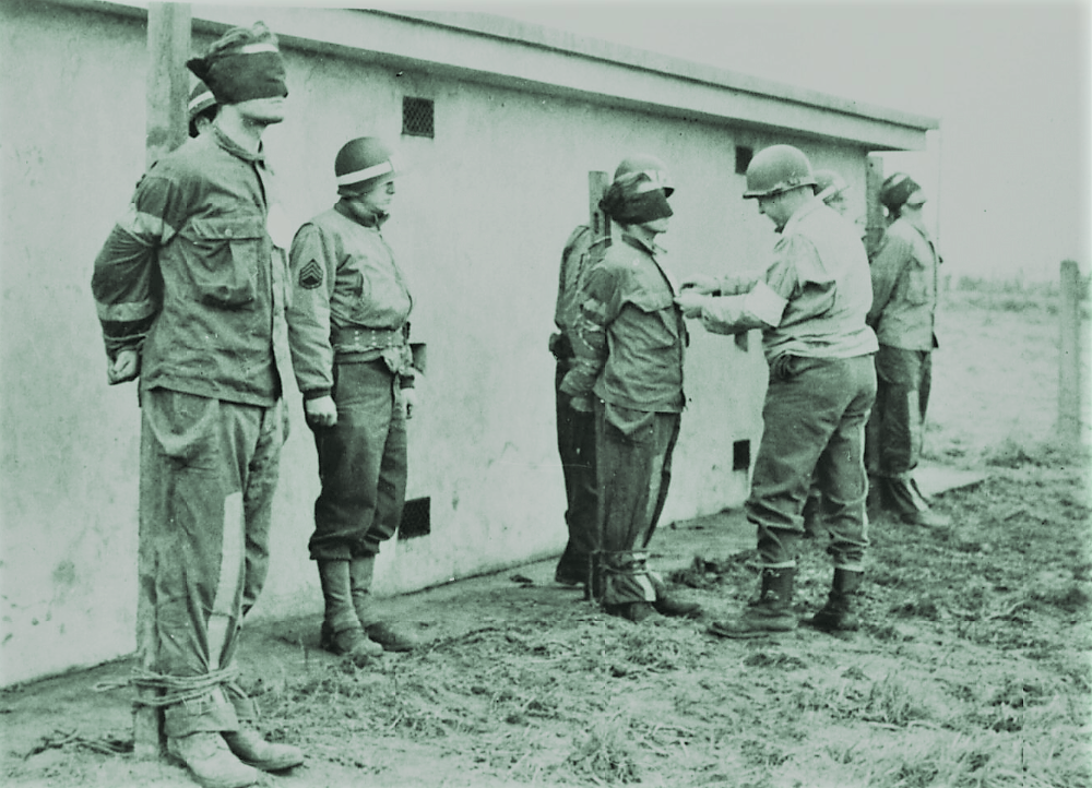 A U.S. military policeman prepares Corporal Wilhelm Schmidt, 24, for the firing squad. With two other German spies, Officer-Cadet Guenther Billing, 21, and Sergeant Manfred Pernass, 23, Schmidt was shot after a court-martial by American authorities in Belgium during the Ardennes offensives. Three Germans were captured wearing American uniforms, armed with American weapons and driving an American jeep during the ill-fated enemy offensive in December 1944. They failed to give the password of any proper identification when stopped and admitted that their mission was to locate and sabotage communications and reconnoitre bridges and roads over the Meuse. Specially trained for espionage, the men had familiarized themselves with the American accent by mingling with U.S. prisoners of war in Germany.