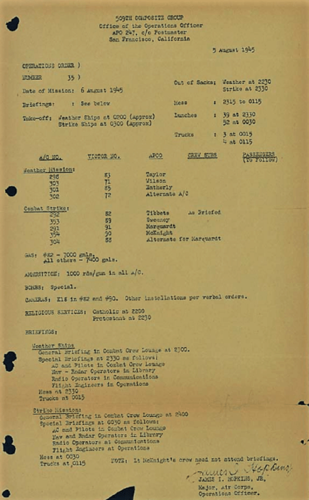 Hiroshima was the primary target of the first nuclear bombing mission on 6 August, with Kokura and Nagasaki as alternative targets. Enola Gay, piloted by Tibbets, took off from North Field, in the Northern Mariana Islands, about six hours flight time from Japan, accompanied by two other B-29s, The Great Artiste, carrying instrumentation, and a then-nameless aircraft later called Necessary Evil, commanded by Captain George Marquardt, to take photographs. The director of the Manhattan Project, Major General Leslie R. Groves Jr., wanted the event recorded for posterity, so the takeoff was illuminated by floodlights. When he wanted to taxi, Tibbets leaned out the window to direct the bystanders out of the way. On request, he gave a friendly wave to the cameras.