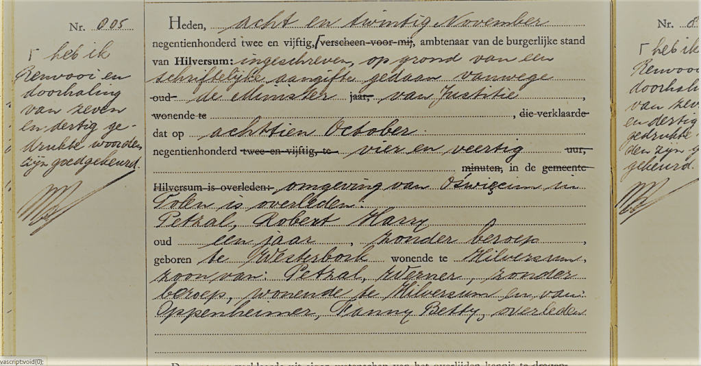 There are no photographs of the two babies—just death certificates. Elisabeth Jeanne Petzal was born with her twin brother Robert Harry on 10 August 1943 at Camp Westerbork. They were children of Werner Petzal and Fanny Betsy Oppenheim. Both were murdered at Auschwitz on 18 October 1944. They were just a year old when they were murdered. It was eight years later when their deaths were registered. On 28 November 1952, the then-Dutch Minister of Justice ordered their deaths to be documented.