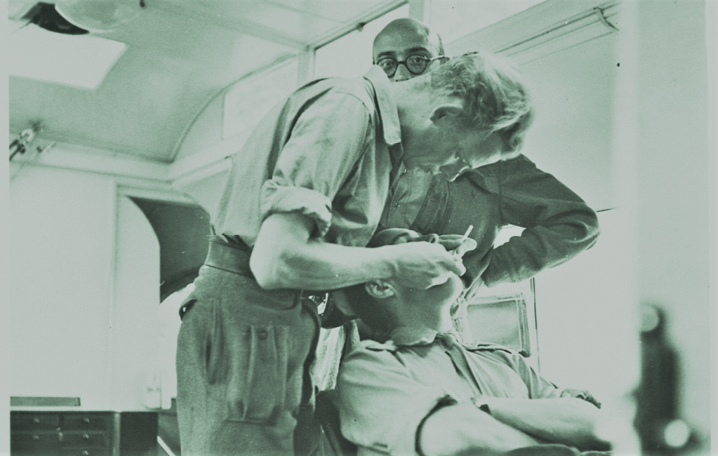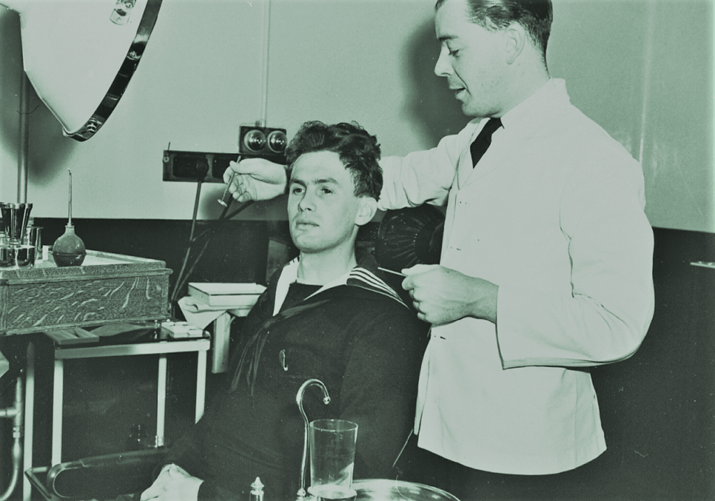 A Dutch recruit is treated by a dentist at the training base in England. Many sailors required dental and medical attention because of their treatment by the Nazis.