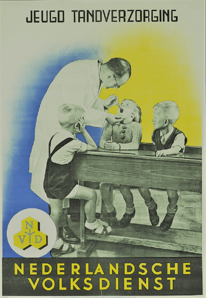 Youth dental care. Dutch People’s Service. The Nederlandsche Volksdienst, Dutch People’s Service or NVD was founded in July 1941 following the example of the Nationalsozialistische Volkswohlfahrt in Nazi Germany. The founders of the NVD wanted to bundle all social work in the Netherlands into the NVD. The NVD was founded on the initiative and with the help of the German occupiers. The occupiers were concerned with the Nazification of social work in the Netherlands. By dedicating oneself to the NVD, one was supporting the enemy.