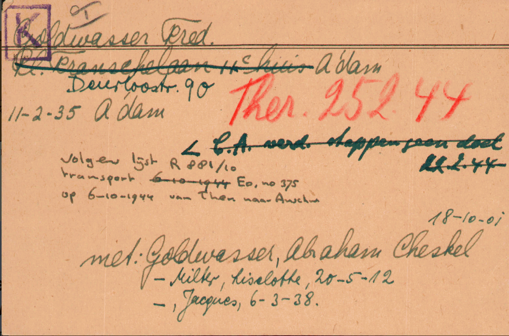 Fred Goldwasser was born in Amsterdam on 11 February 1935. He was murdered at Auschwitz Concentration Camp on 8 October 1944. He was 9 years old. Fred’s brother Jacques was also born in Amsterdam on 6 March 1938. He was murdered in Auschwitz on the same day as his brother. He had reached the age of 6 years.