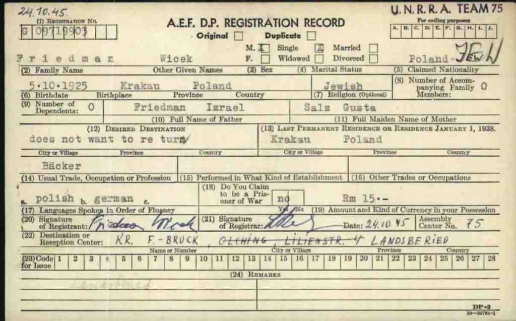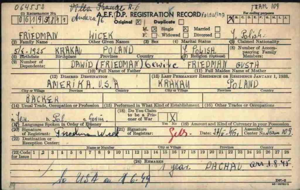 Lynn sent me a number of documents relating to her father, Wicek Friedman, which changed to Victor Friedman. That fact on its own is a good indication that after the Holocaust, the struggle continued—changing your name is not something you do lightly. I presume he changed it to make it easier for the people in his adopted land to be able to pronounce his name. I say adopted land because that is what struck me when I saw the document of the Displace Persons registration (photo at the top), which says, “Does not want to return.” He was born in Krakow, Poland on October 5, 1925.