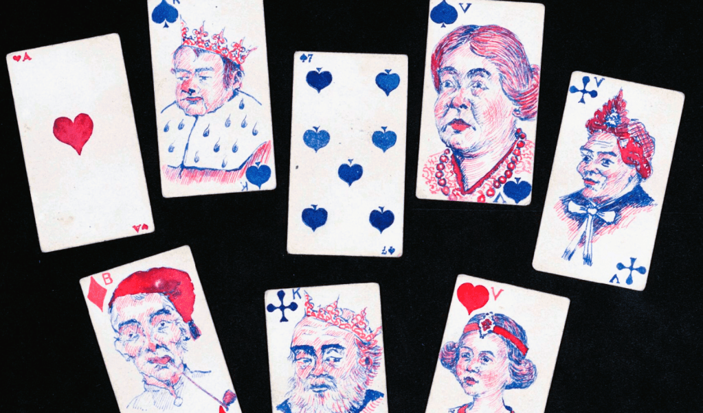Picture of the deck of cards below was stored in a white cardboard box with a blue diamond pattern. The cards s are drawn and colored by hand. Some have images related to Camp Vught, in the Netherlands: including the Ace of Spades, the main building and the prison of the camp; on the Ace of Clubs the Roman Catholic Church of the camp, and on the Jack of Spades the ‘Jack’ is a camp guard in a barbed wire frame.