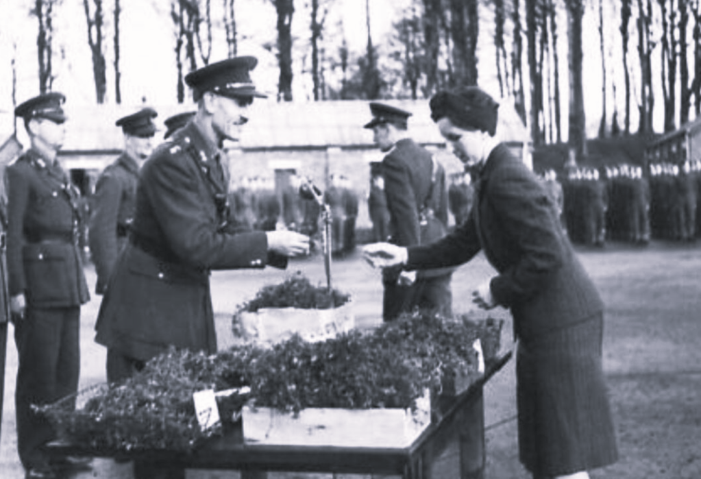 The wife of Lieutenant Colonel R.A. Heard M.C. presented shamrocks to recruits at the 25th Infantry Training Centre in Omagh, Co. Tyrone, 1943.