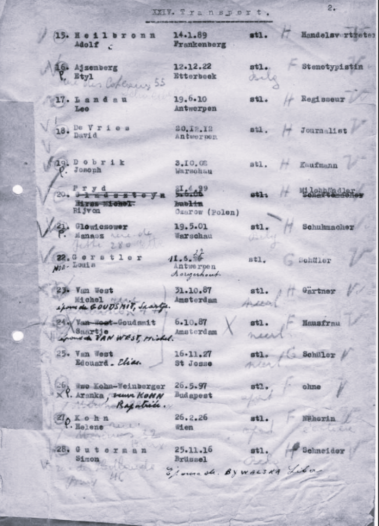 Michael and Saartje were deported from Mechelen to Auschwitz on 4 April 1944 with convoy 24, which arrived there on 7 April 1944 with 625 victims in total. Of these, 270 were murdered immediately upon arrival in the gas chambers of Auschwitz-Birkenau; 355 people were registered in the camp, of which 147 were still alive when Auschwitz was liberated.