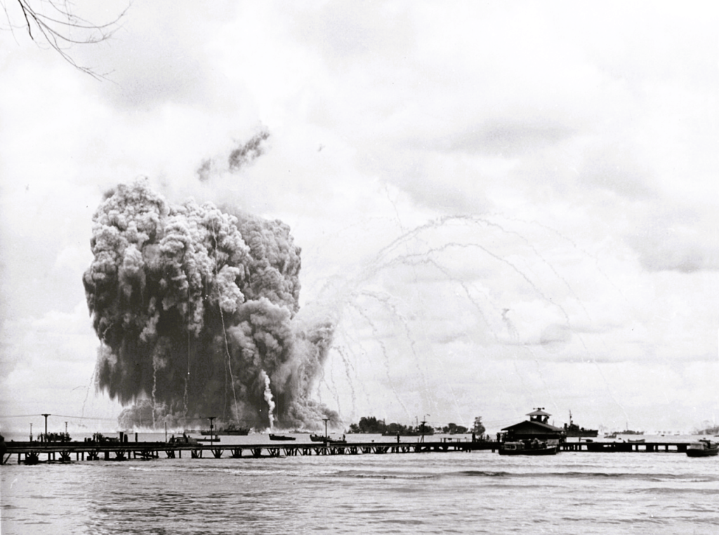 On the morning of November 10, 1944, at 8:30 a.m., Lt. Lester A. Wallace, USNR, Mount Hood‘s communications officer, along with a party of 17 men, left the ship for shore. At 8:55 a.m., while on the beach, they saw a flash from the harbor, followed by two quick explosions. Racing back to the water’s edge, they observed, in Lt. Wallace’s words, “There was nothing but debris all around…”