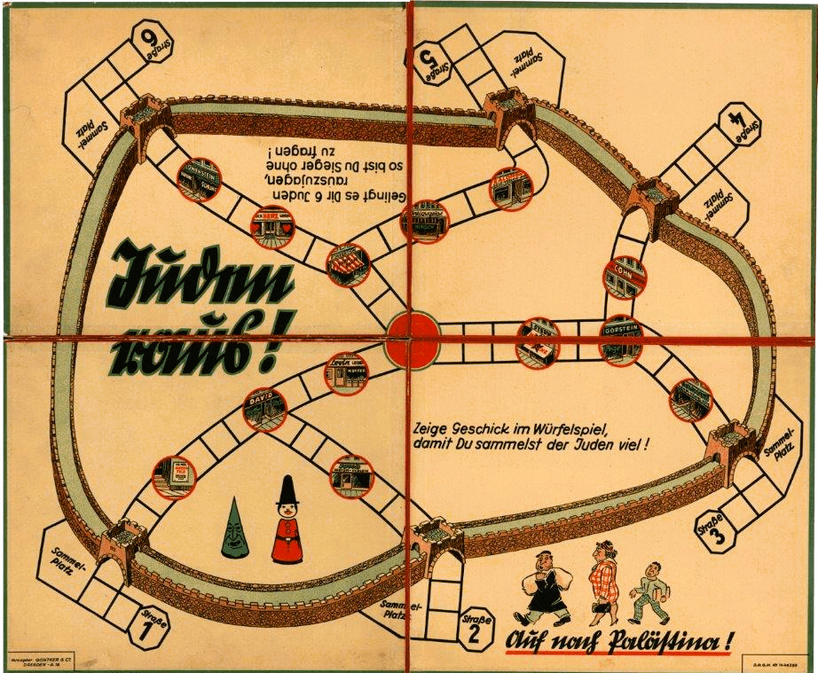 Players would take turns rolling the dice and moving their “Jews” across the map toward “collection points” outside the city walls for deportation to Mandatory Palestine. Written on the game board was, “If you manage to send off six Jews, you’ve won a clear victory.”