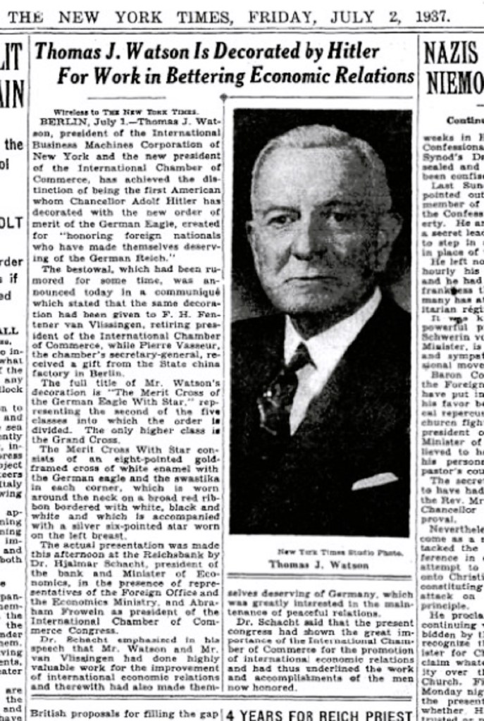 Watson was awarded a medal by Adolf Hitler in 1937, symbolizing IBM’s cooperation with the Nazi regime.