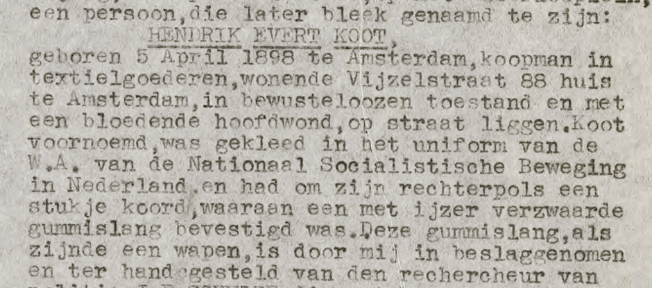 On February 11, 1941, the NSB member Hendrik Koot was injured fatally during a brawl at Waterlooplein. The official reports on the incident remained lost for decades.