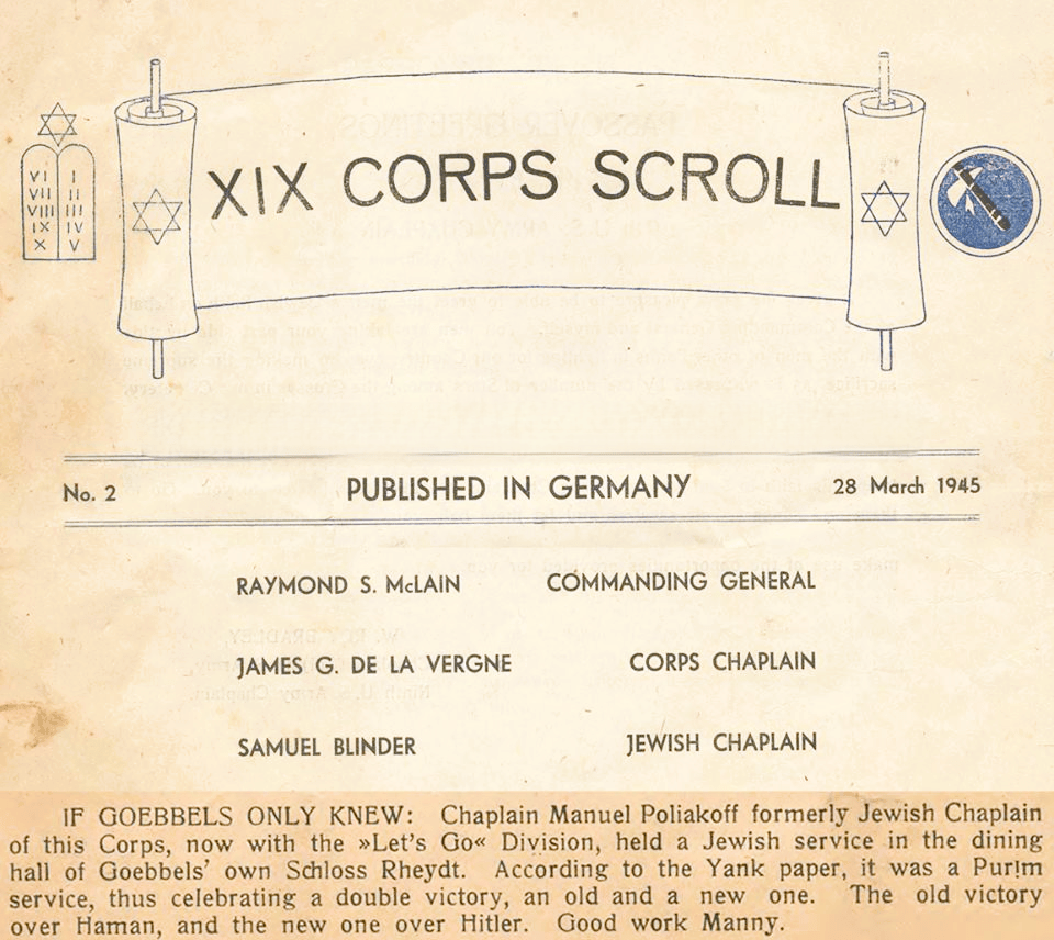 Cpl. Howard Katzander wrote in Yank that Chaplain Poliakoff, assisted by PFC Arnold Reich and Cpl Martin Willen led the soldiers in an ancient Hebrew hymn of jubilation traditionally sung at Purim. The song, celebrating the Jews’ deliverance from Haman—the biblical villain often compared to Hitler—added a deep historical and emotional weight to the moment.