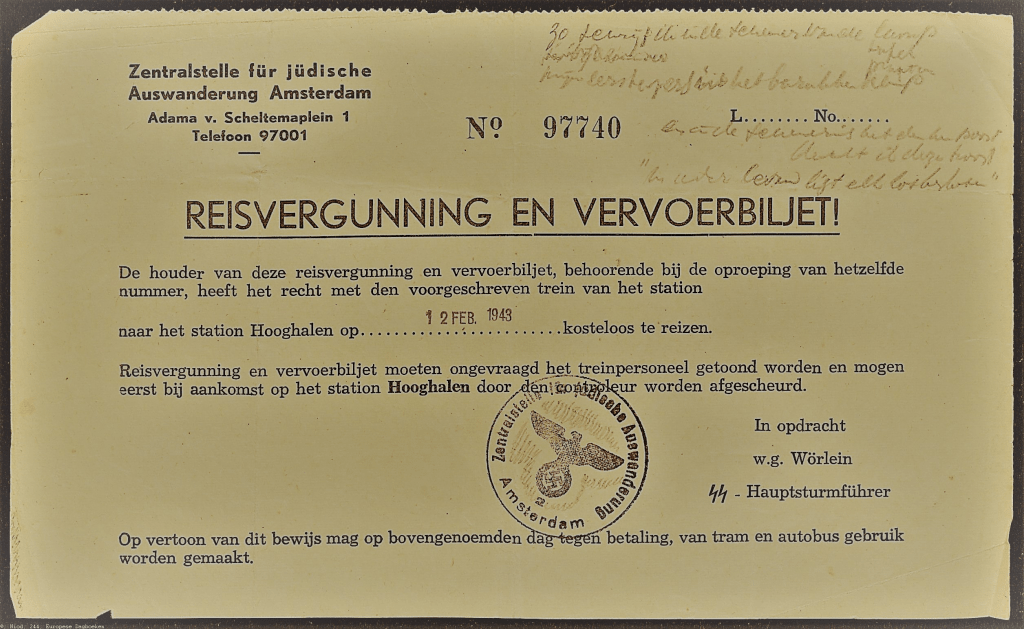Issued by the Centre of Jewish Emigration Amsterdam and authorized by SS-Hauptsturmführer Woerlein, the ticket read: