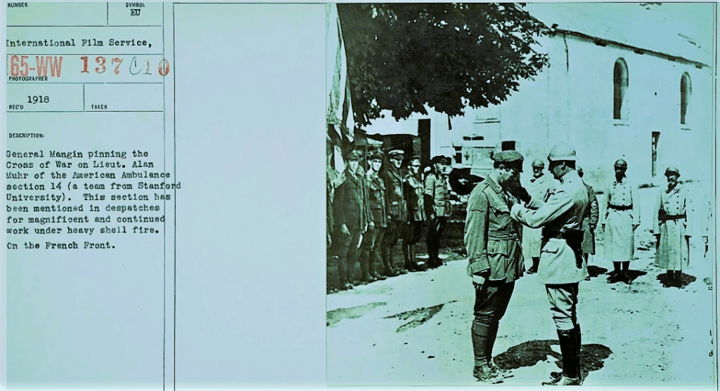 During World War I, Muhr demonstrated his courage and commitment to the war effort by volunteering as an ambulance driver. He risked his life transporting wounded soldiers from the front lines to medical facilities, showing great selflessness. Allan led a voluntary unit of ambulance drivers who transported the wounded soldiers from the front to the American Ambulance Hospital, which had been founded by Americans in Paris when the war broke out. When the USA entered the war in 1917, this organization was integrated into the US Army, and so Allan also became an officer in the American armed forces, where he continued his service, earning a U.S. Army medal for his bravery and dedication to his duties.