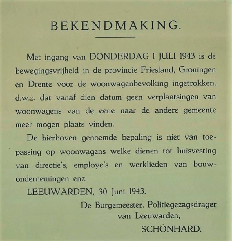 Sinti and Roma people were required to live in assembly camps outside of cities starting June 22, 1943, in locations such as near The Hague and Eindhoven. At the request of the Nazi occupiers, caravans were gathered in these areas, concentrating the Sinti and Roma populations. It made it easier for the occupiers to arrest them a year later during the gypsy roundup.