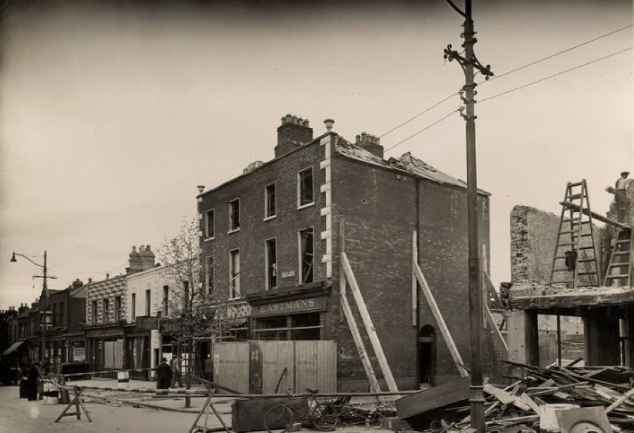 In the early hours of May 31, 1941, several bombs were dropped on Dublin by German aircraft. The most severe damage occurred in the North Strand district, a working-class neighborhood. Four bombs struck the area, destroying approximately 300 houses, damaging many more, and leaving hundreds homeless. The death toll reached 28, and around 90 people were injured, many seriously. The blast was so powerful that it left a crater and obliterated entire buildings.