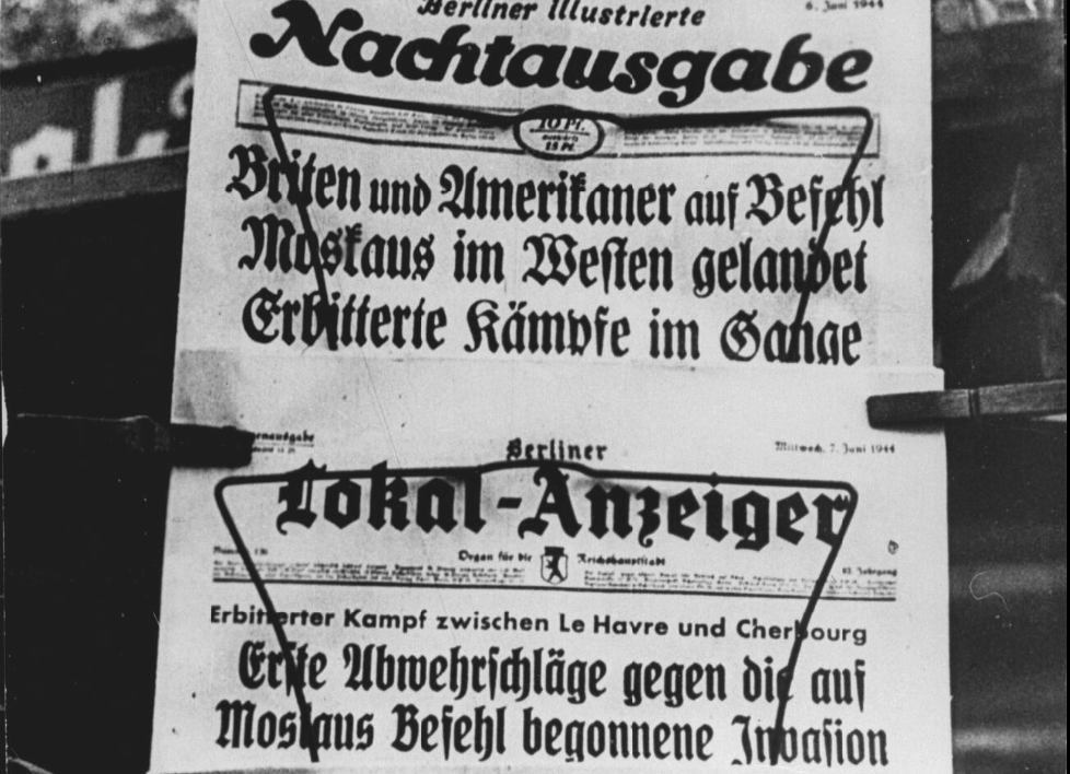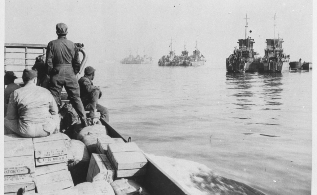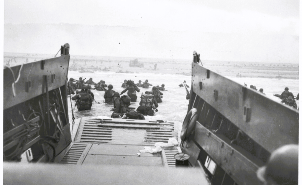 Down the ramp of a Coast Guard landing craft, American soldiers surge toward the beach under a hail of enemy fire. It is D-Day — the massive Allied invasion of Nazi-occupied France. Ahead, troops can be seen lying flat, taking cover from the relentless machine gun fire of entrenched German defenders.