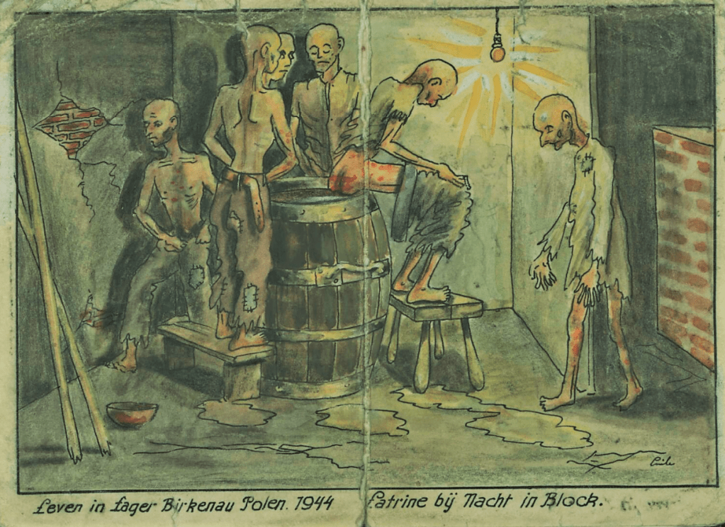 “Life in Lower Birkenau Poland, 1944 Latrine at Night in Block.”