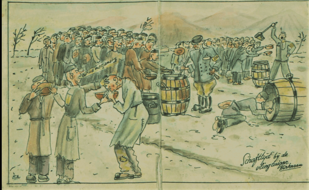 I also know he spent time in the Vught concentration camp, and from there he was transported to Westerbork on 18 October 1943. After that, he was deported on 3 March 1944 to Auschwitz-Birkenau. The caption of the drawing at the top of the blog says, “Mealtime at the planes, Birkenau.”